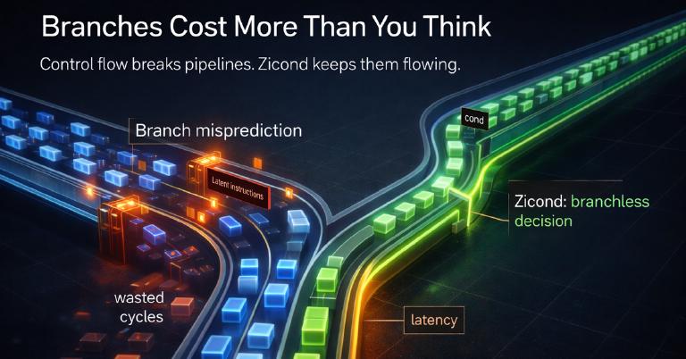 RISC‑V’s base ISA was designed with deliberate minimalism. Every instruction must justify its encoding space, and the original rationale for omitting conditional select was straightforward: branches are “good enough” for conditional patterns, and branch predictors handle the common case.